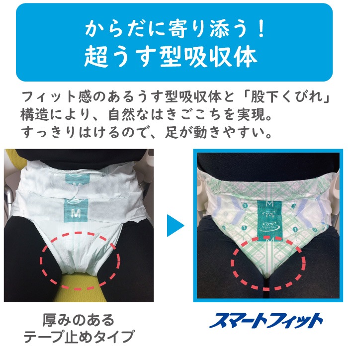 「リフレスマートライン スマートフィットテープ止めタイプ」は動きを阻害しない、かるいはきごこちが特長です。