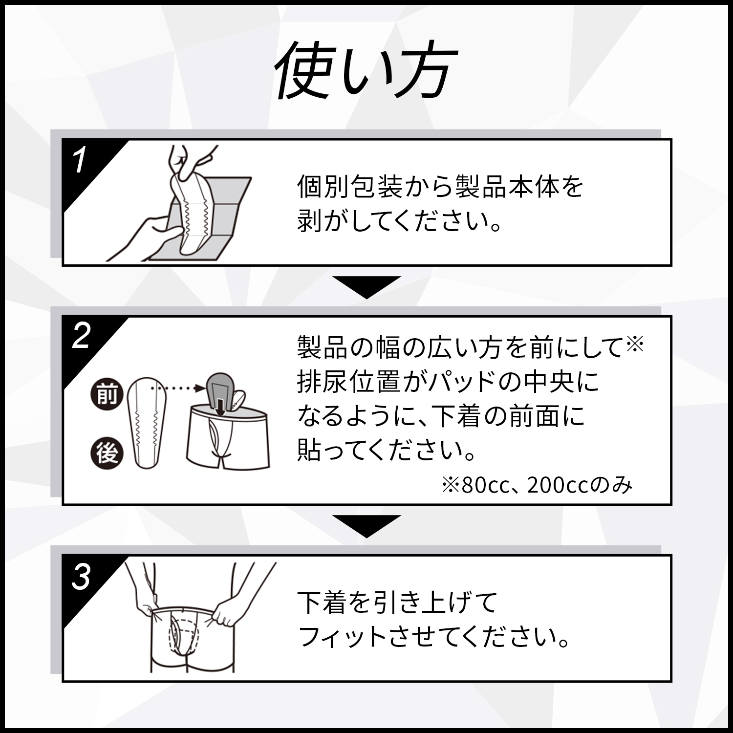 2. 排尿位置がパッドの中央になるように、下着の前面に貼ってください。