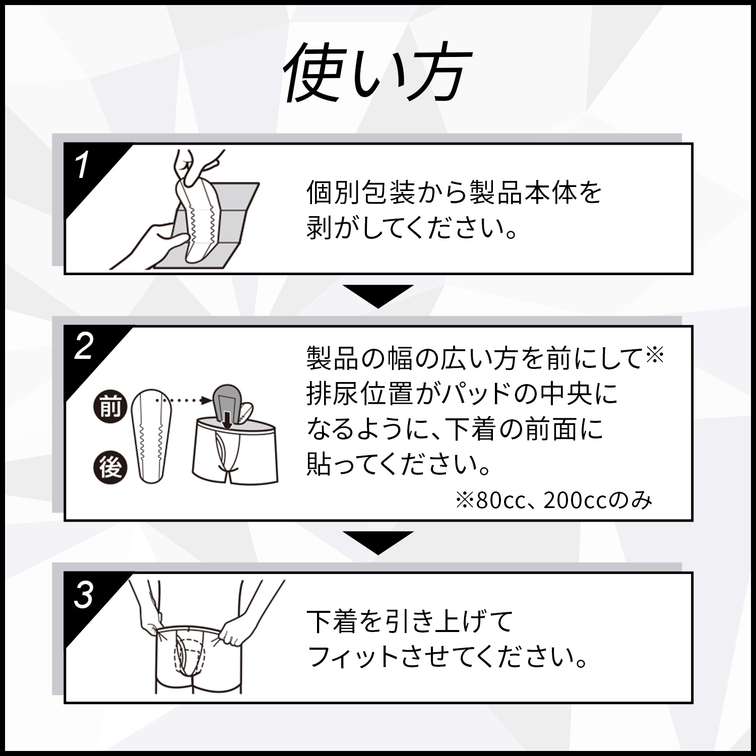 2. 製品の幅の広い方を前にして、排尿位置がパッドの中央になるように、下着の前面に貼ってください。