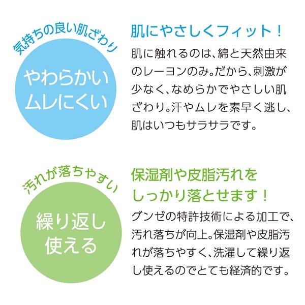 グンゼの特許技術による加工で、保湿剤や皮脂汚れが落ちやすく、洗濯して繰り返し使えるのでとても経済的。