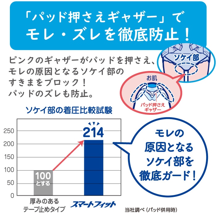 ●パッド押さえギャザーでモレ・ズレを徹底防止!