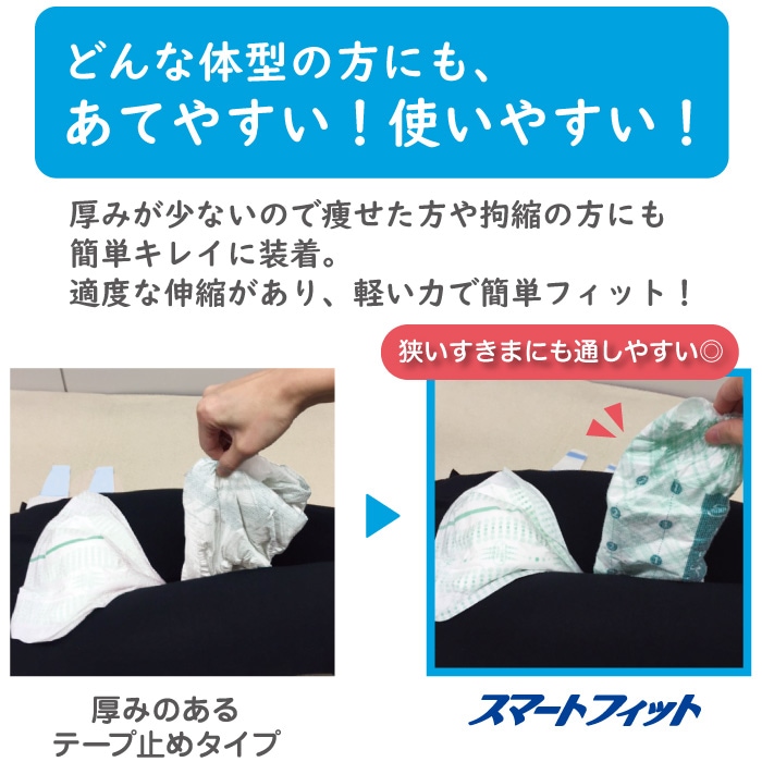 「リフレスマートライン スマートフィットテープ止めタイプ」は動きを阻害しない、かるいはきごこちが特長です。